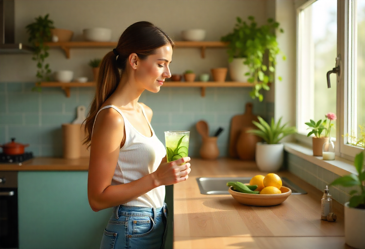 Include gentle digestive drinks: Peppermint or chamomile tea relaxes digestive muscles and calms the nervous system. Warm water with lemon gently wakes digestion. Cucumber water hydrates and signals your body to release excess fluid.