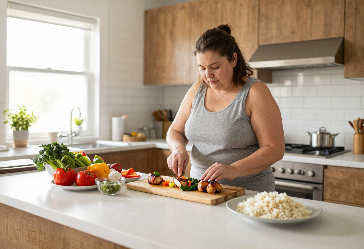 Woman in a sunlit kitchen preparing a balanced plate with vegetables, grilled fish, and quinoa, with a notebook and water nearby, illustrating healthy habits to manage weight changes during menopause