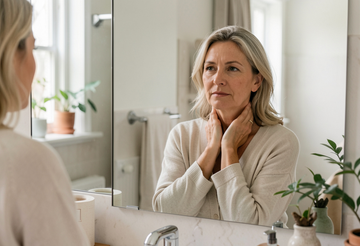 Slightly overweight adult looking tired and thoughtful in front of a bathroom mirror, gently touching the front of their neck, representing thyroid symptoms